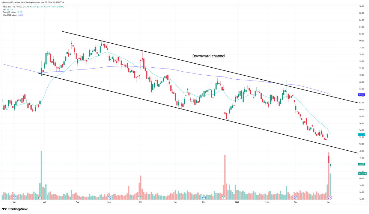 The latest move makes the setup more serious. Nike has now broken below the lower end of that channel instead of simply bouncing inside it again. In the most recent session, the stock opened at $43.76, traded as high as $44.34, fell to $43.17, and closed at $44.19. The 20-day EMA sits at $52.77 and the 200-day EMA at $64.33, leaving Nike well below both trend markers. That is a bearish alignment and shows the stock is trading with weak short-term momentum inside a much weaker long-term trend.